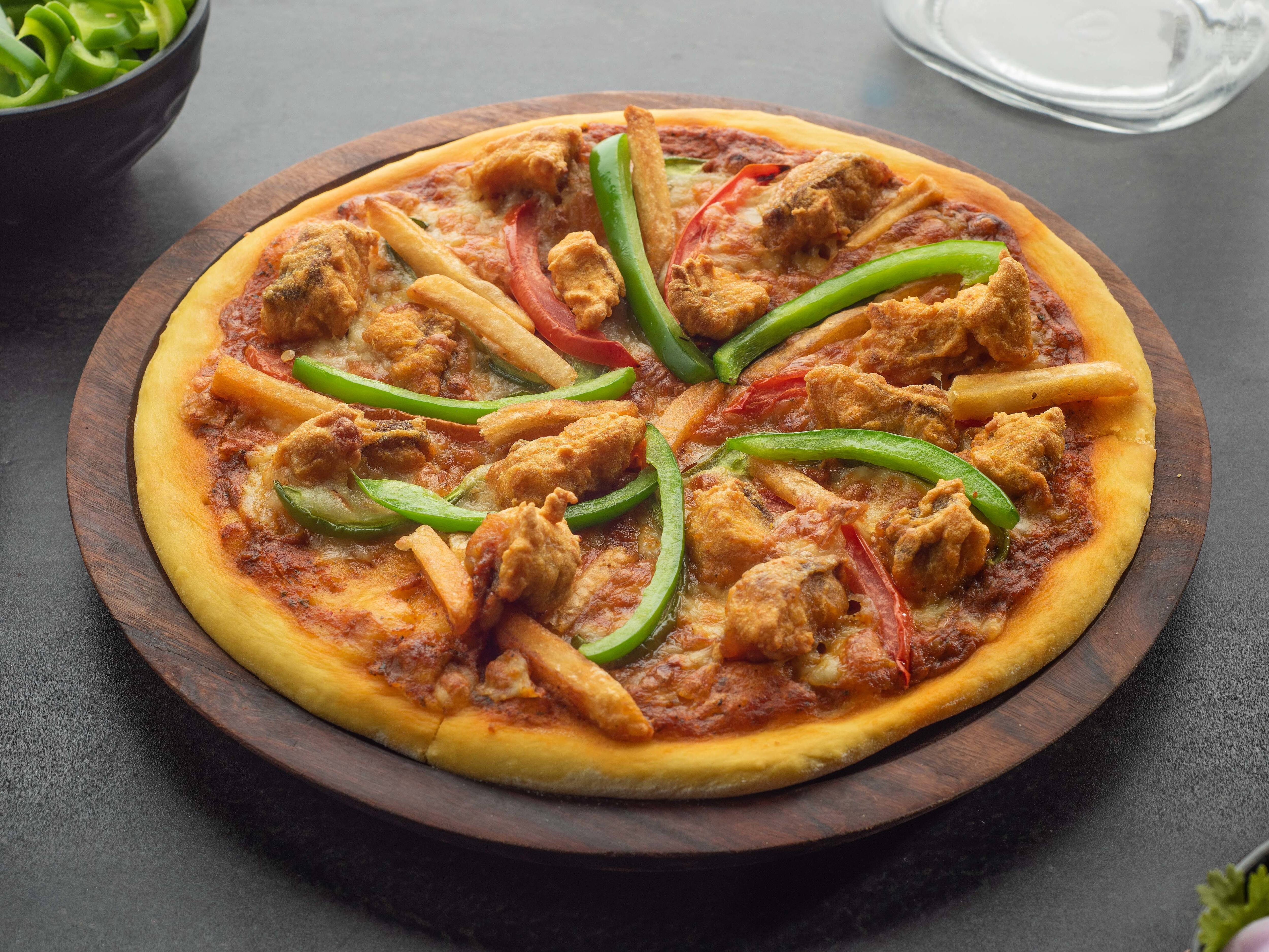 Teekha Paneer Tikka Tandoori Pizza: Hot and spicy paneer tikka with desi butter masala and cheese on a tandoori pizza crust with a house special spice mix
