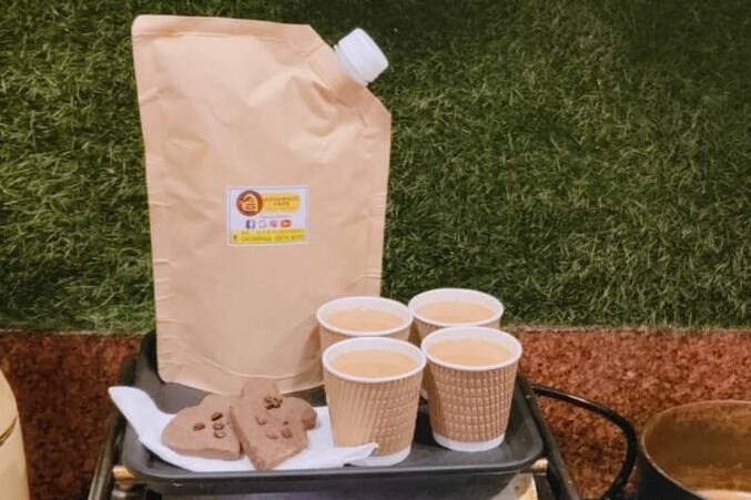Four cups of kesar chai of 100 ml each served with four handmade fresh baked chocolate cookies without arrowroot and preservatives.