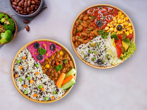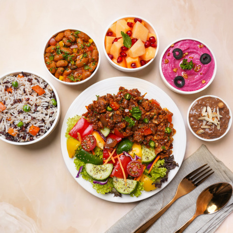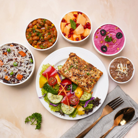 [Energy -796kcal | Protein - 30gm] A power packed meal with wild rice mix, mix bean stew, sauteed plant protein and Greek salad mix. Served along with beetroot hummus, diced muskmelon and choco coffee pudding. - Antioxidant rich - Protein Power Allergen Information: Contains Gluten, Dairy, Soy, Sesame Seed & Nuts