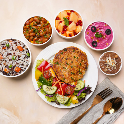 [Energy - 815kcal | Protein - 30gm] Densely rich, high protein meal with antioxidant rich wild rice mix, mix bean stew, beetroot hummus and chicken patty. Served along with the wholesome Greek veg salad, diced muskmelon and choco coffee pudding. Allergen Information: Contains Gluten, Dairy, Egg, Soy, Sesame seed & Nuts