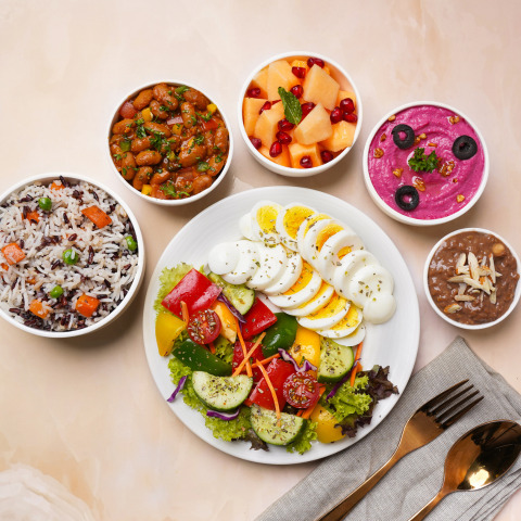 [Energy - 867Cal | Protein - 35gm] A power-packed meal comprising of wild rice mix, mix bean stew, sliced boiled eggs and crunchy salad mix. Served with beetroot hummus, diced muskmelon and choco coffee pudding. A wholesome meal for one! - Antioxidant rich - Protein Power Allergen Information: Contains Gluten, Egg, Dairy, Sesame seed & Nuts