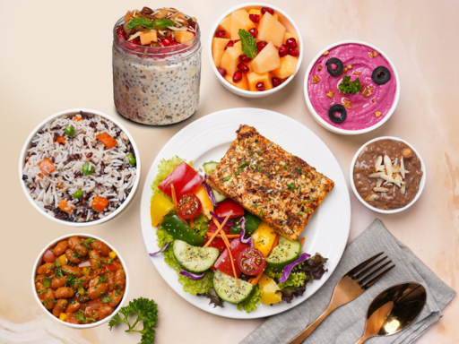 [Energy - 896kcal | Protein - 34gm] A power packed meal with antioxidant rich wild rice mix, mix bean stew, beetroot hummus, protein rich paneer patty. Served along side of a nutrient dense Greek veg salad, diced muskmelon and choco coffee pudding. Allergen Information: Contains Gluten, Dairy, Soy, Sesame seed & Nuts