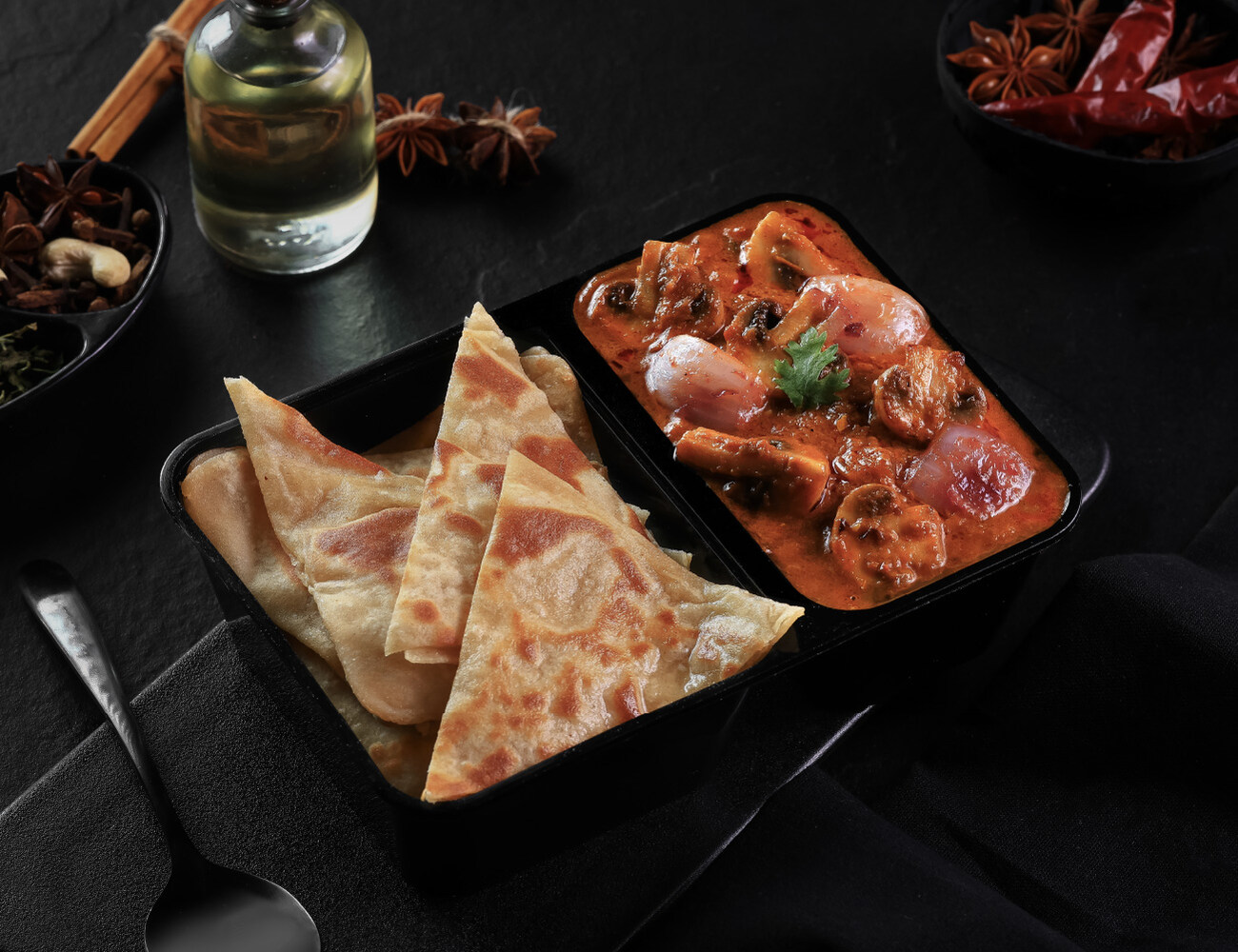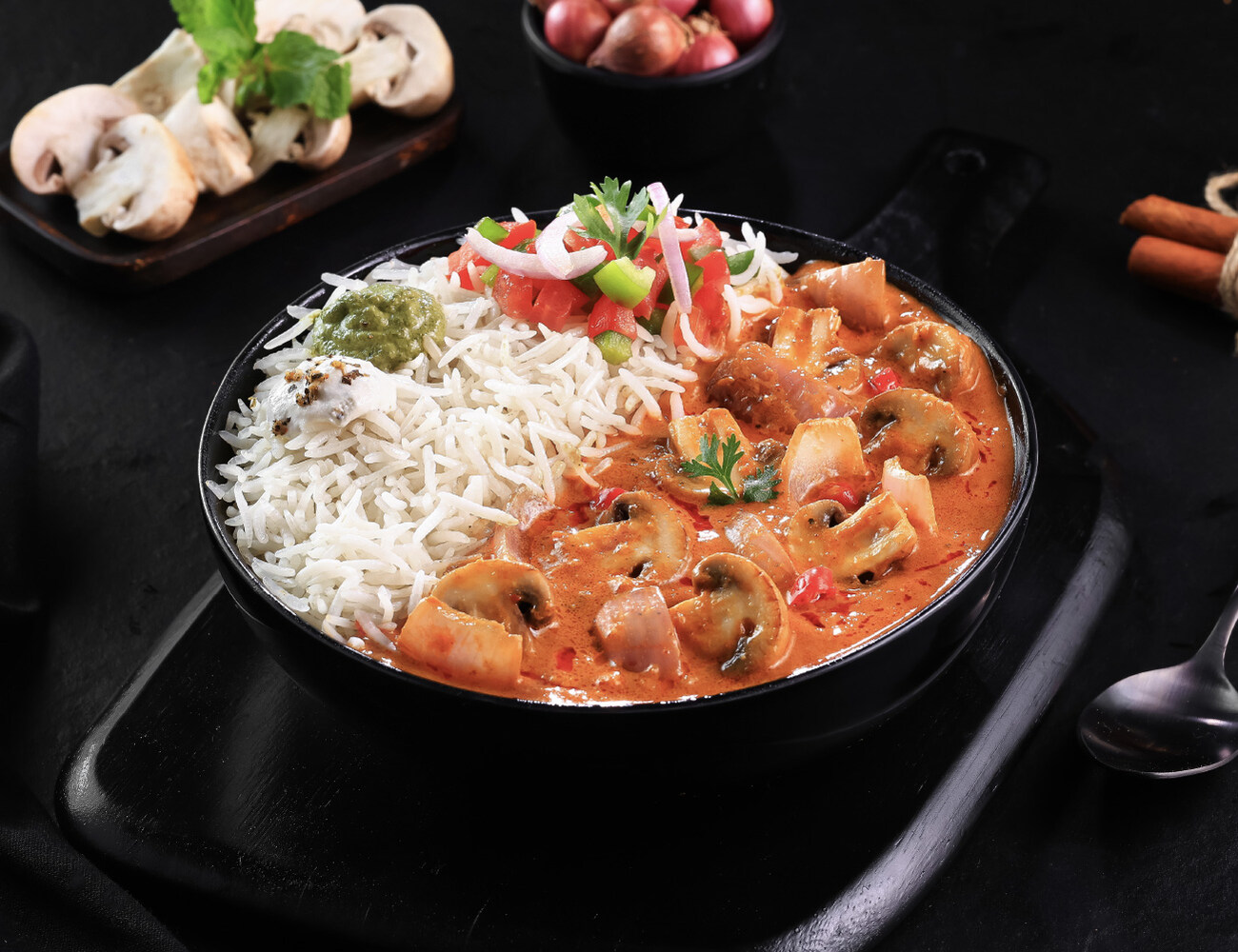 [Serves 1] Comes in a bowl with Masala Rice + Fresh earthy mushrooms simmered in a rich curry seasoned with Punjabi masalas + Green Chutney + Garlic Y