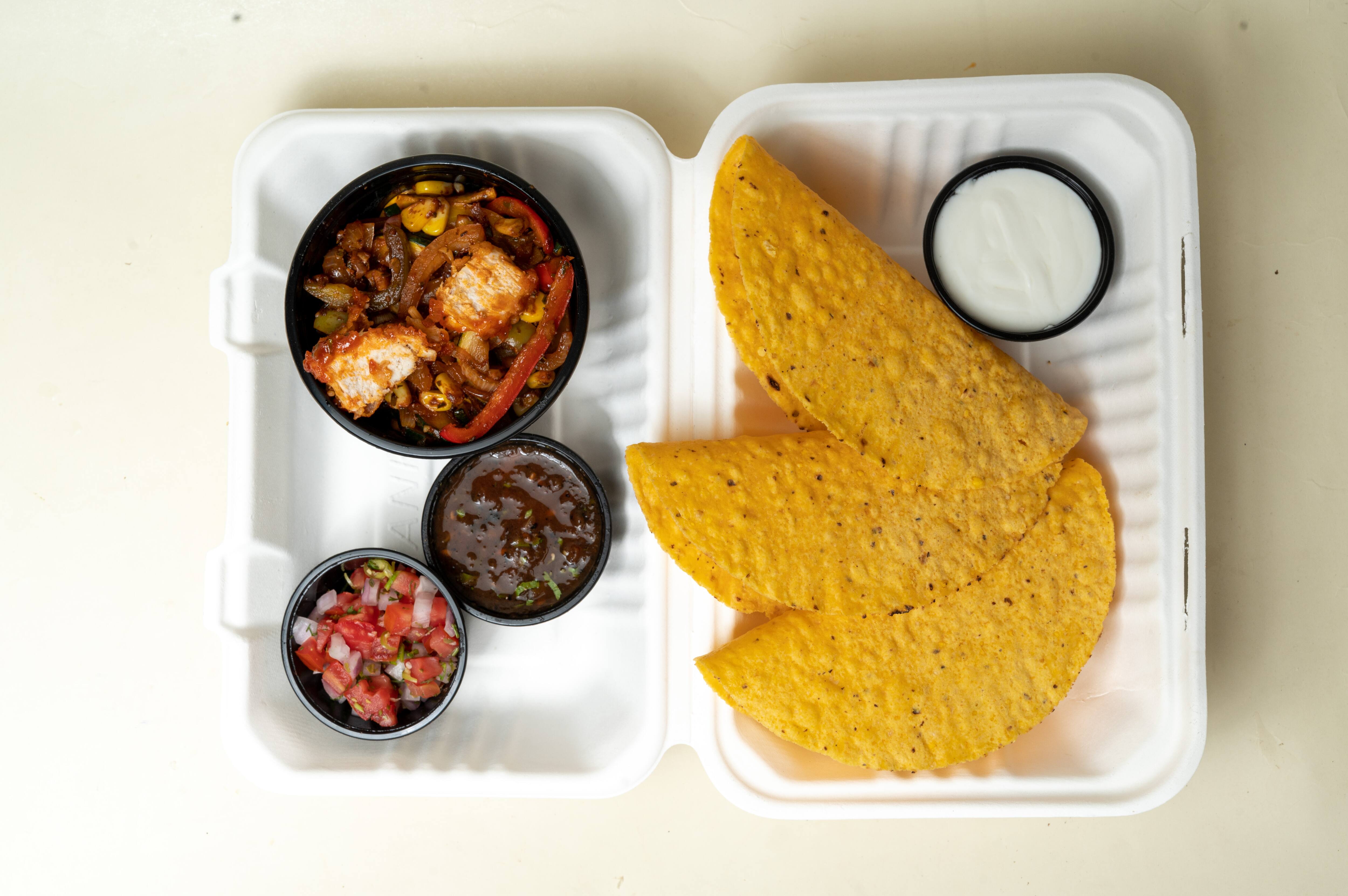 [Veg preparation] Delicious and yum vegetarian tacos made with refried beans, tomato salsa and sour cream.