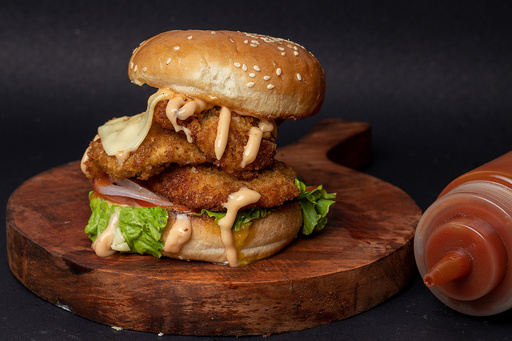Fresh Toasted Bun with Crispy Fried Chicken, Tomatoes, Lettuce, Caramelised Onions, Cheese and Sauces.