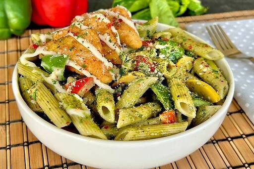Savor the delicious Creamy Harissa Chicken pasta, a dish that combines tender chicken with al dente pasta and is enhanced by the rich tomato sauce and smoky harissa flavor. Richly enhanced by colorful bell peppers, olives and a smooth combination of cream and bechamel sauce, this dish is finished with a dollop of melted cheese and a dash of chili flakes, resulting in a pleasing harmony of flavors and textures in each mouthful.