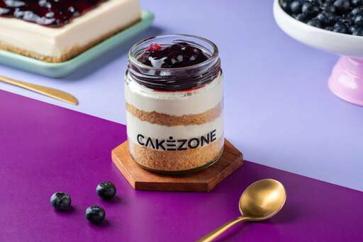 [Eggless]. 120 gm. This slice is combination of creamy cheesecake, buttery crust, and vibrant blueberry filling flavor, all presented with a touch of French culinary elegance, creates a delicious dessert. (521 Calories, Protein-6g, Carbs-40g)