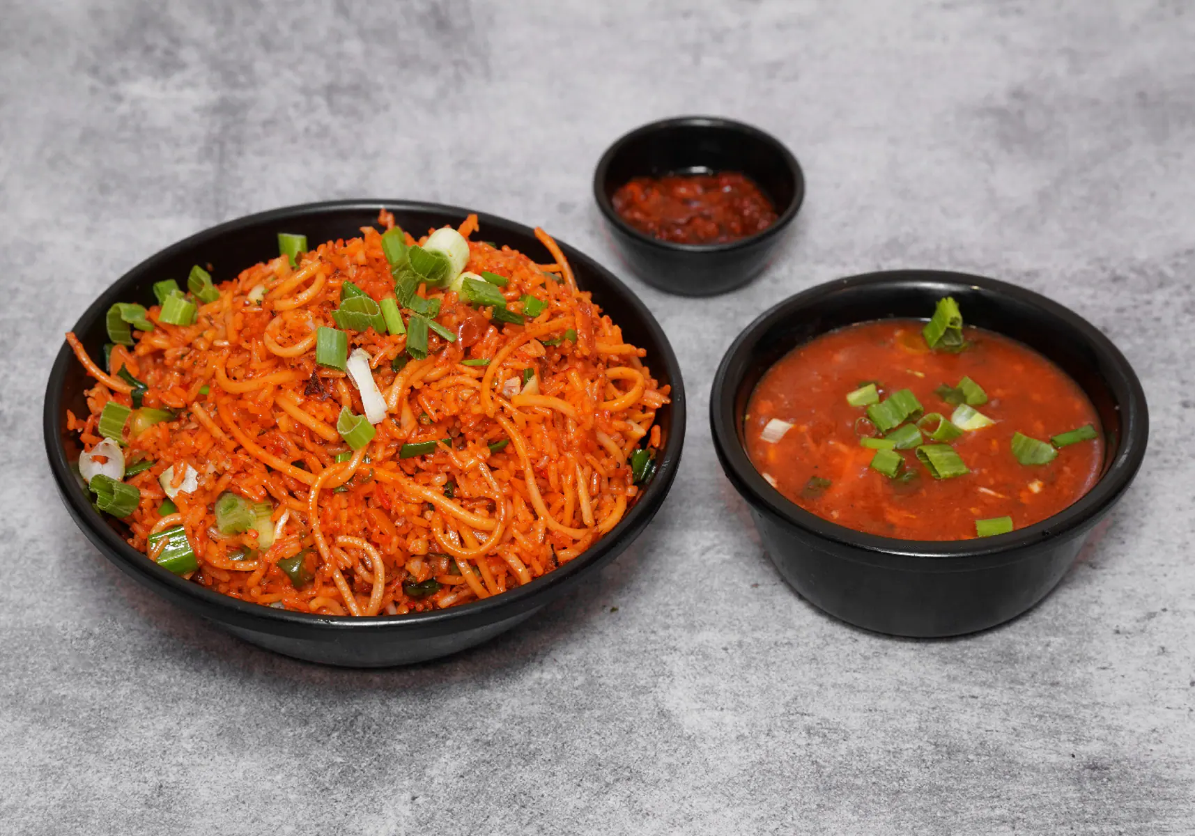 A delicious combination of fried rice, noodles and spicy gravy loaded with fresh vegetables and aromatic spices. A flavorful and satisfying meal.