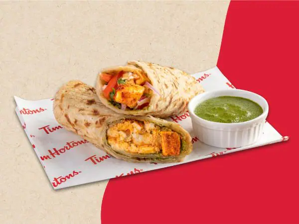 Chunky paneer tikka with onions, tomatoes, green chillies, mint chutney and mayonnaise in a wrap. This wrap packs a spicy punch!
