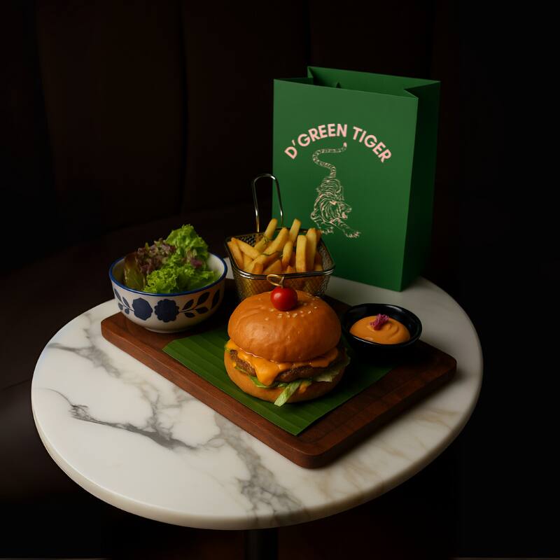 [Veg preparation] Moringa chickpea fritters, white bean hummus, muhammara and pickled vegetables and rocket leaves. Served with French fries and some salad [Subject to Availability].