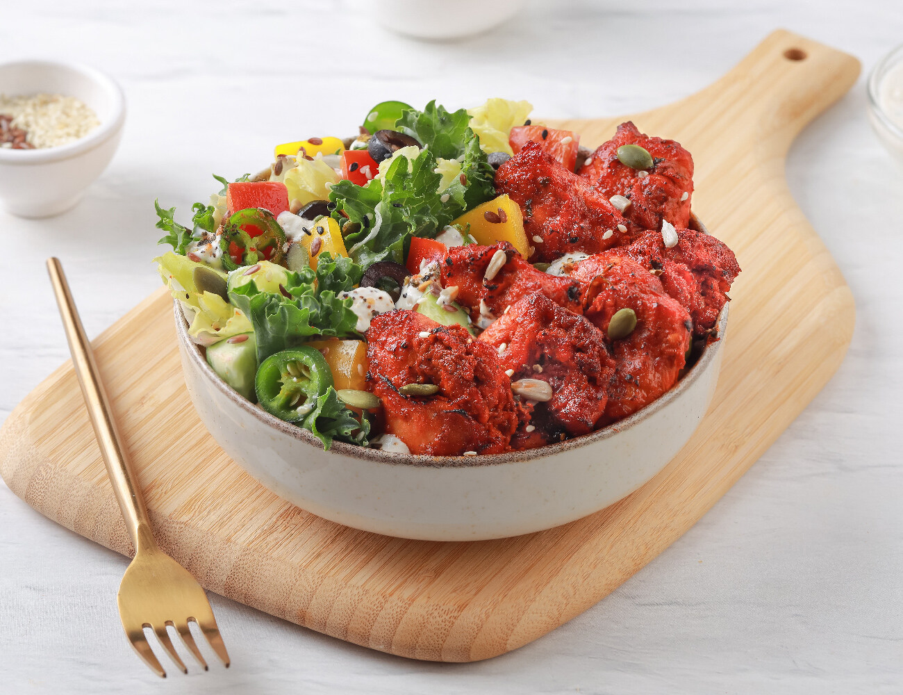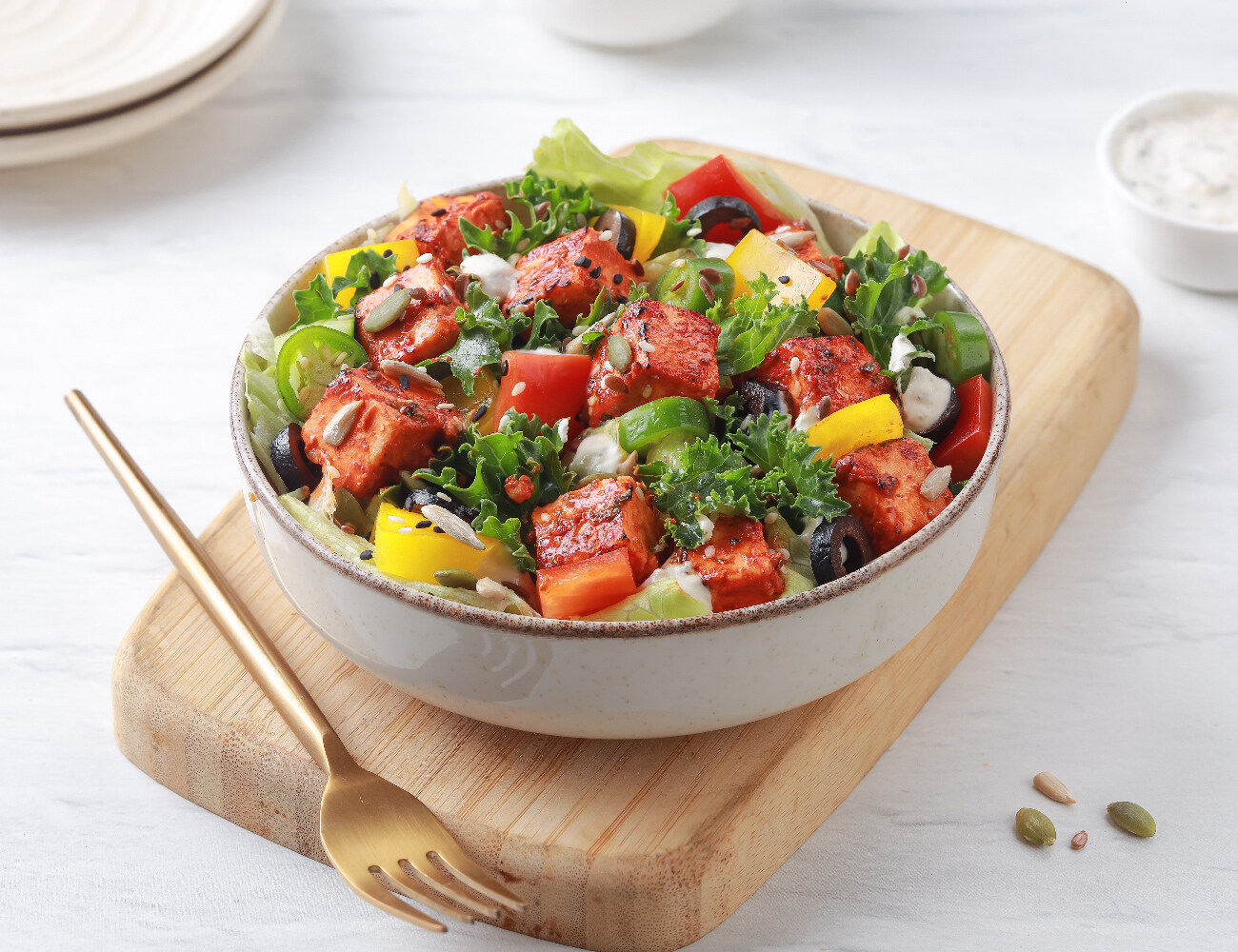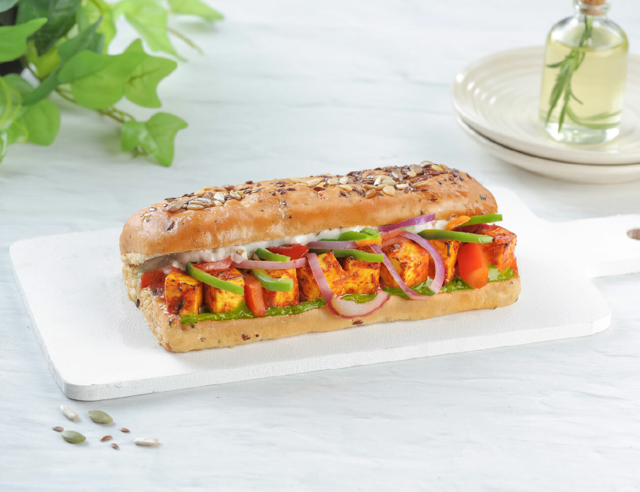 Paneer Tikka | Spreads: Green Chutney, Thick Yogurt | Capsicum, Tomato, Onion | Multi-Grain Bread Protein: 30g | Carbs: 71g | Fat: 36g | Fiber: 6g