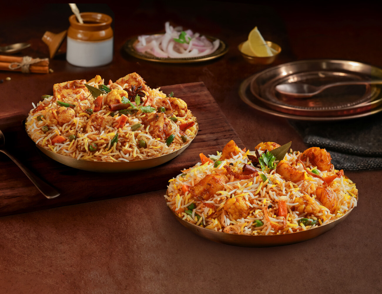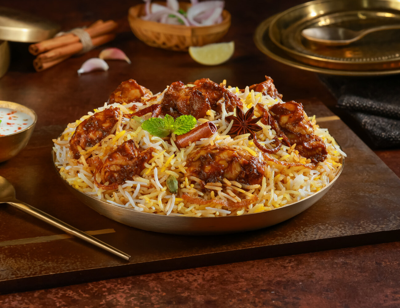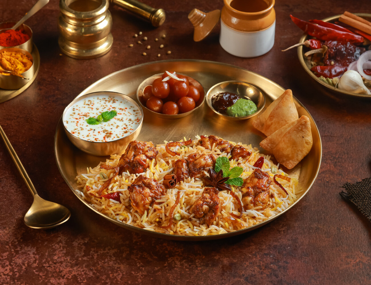 Dum Aloo Biryani + Raita + 2 Mini Samosas + Imli Chutney + Hari Chutney + Onions + Dessert