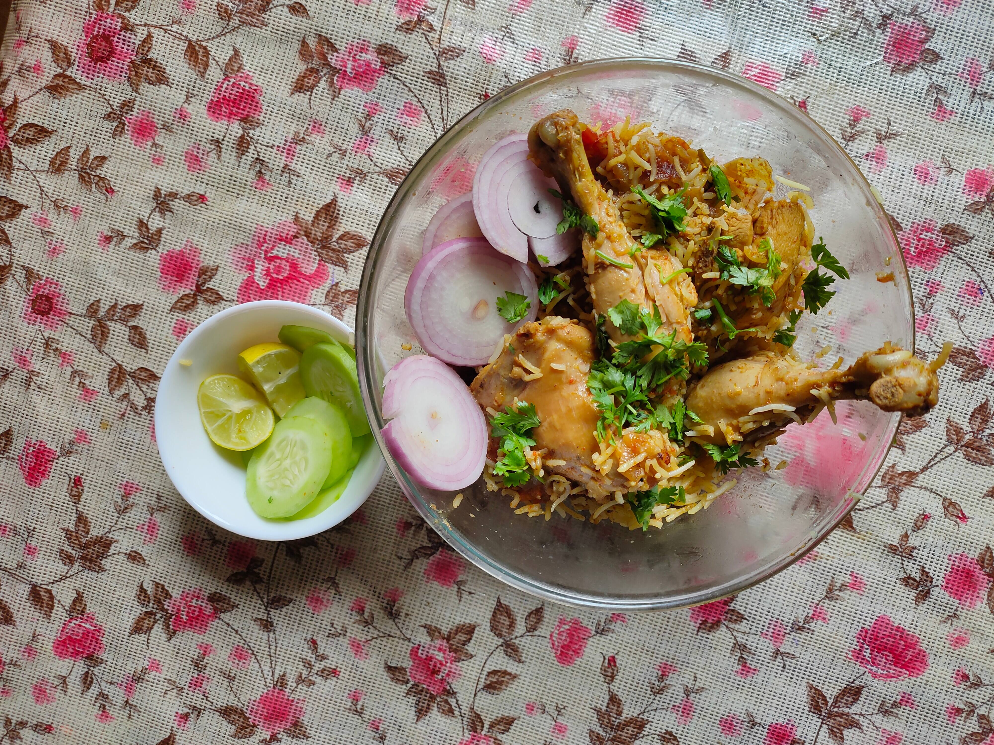 Goodness of rice and juicy chicken which comes in layers and served with green chutney.