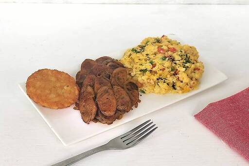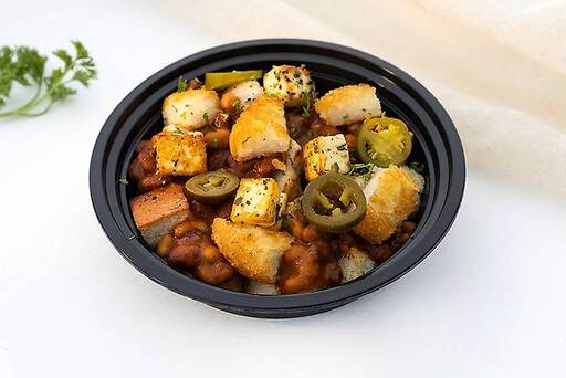 Start your day with herbed potatoes, tender pulled BBQ chicken, a refreshing veggie salad, spiced masala egg, and soft diced focaccia. With a perfect mix of protein, fiber, and complex carbs, this hearty bowl fuels energy and keeps you full longer.