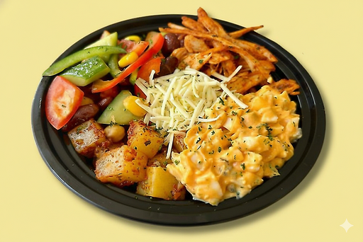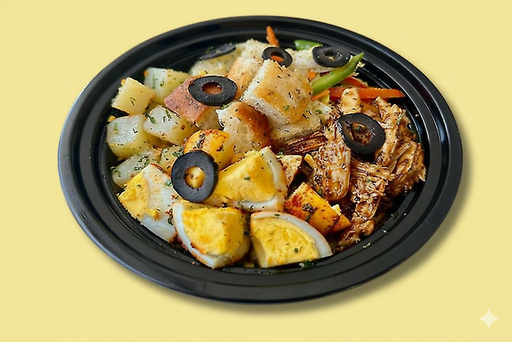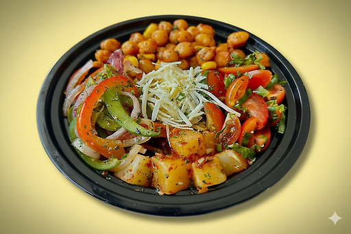 Pulled herb chicken, a refreshing mixed veggie salad, creamy egg spread, and grated cheese come together over a spicy potato base. Packed with protein, fiber, and essential nutrients, this wholesome bowl fuels your day with lasting energy and bold flavors