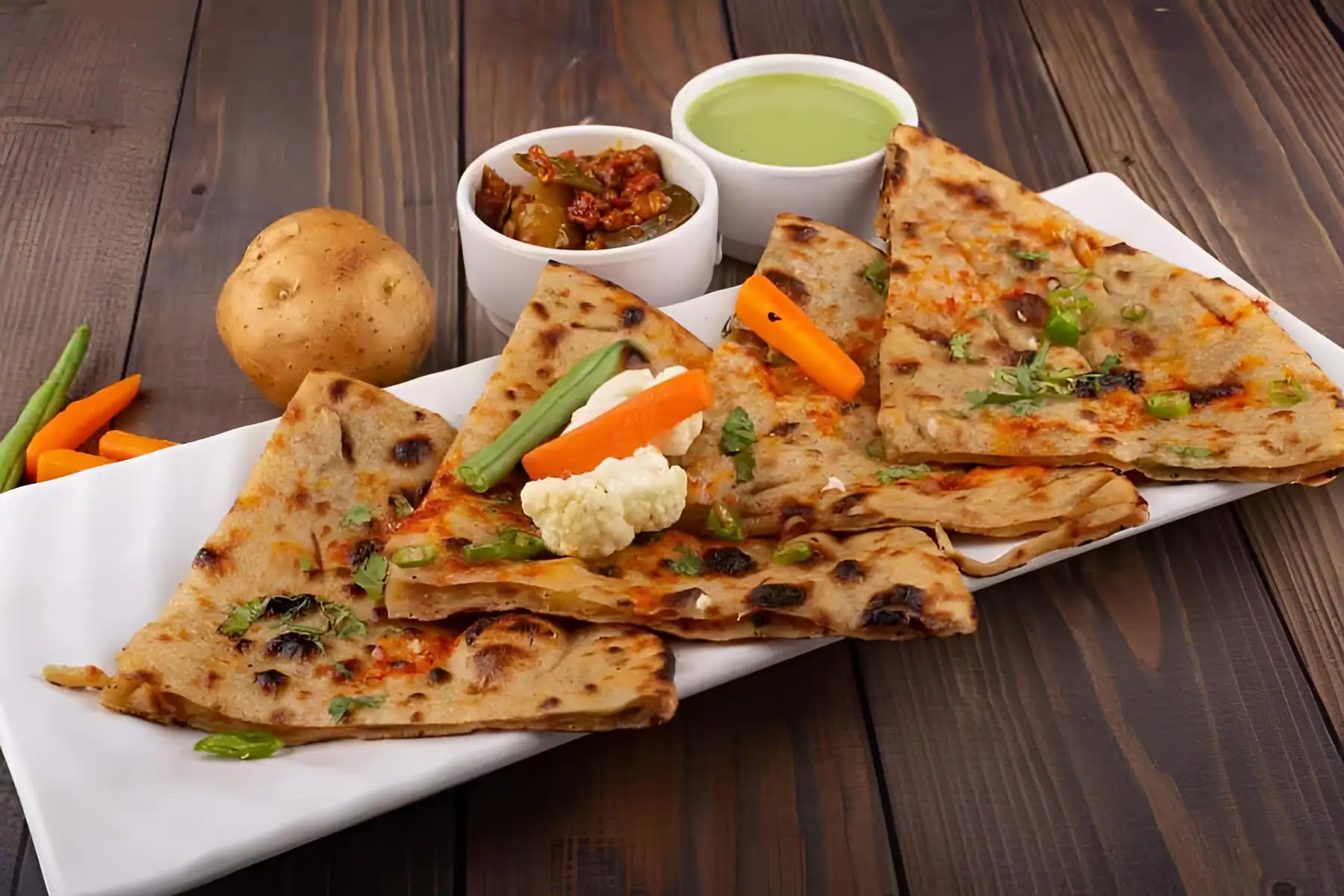 Authentic North Indian Style Paratha Stuffed Aloo Pyaz And Species With Plain Curd, Pickle And Green Chutney.
