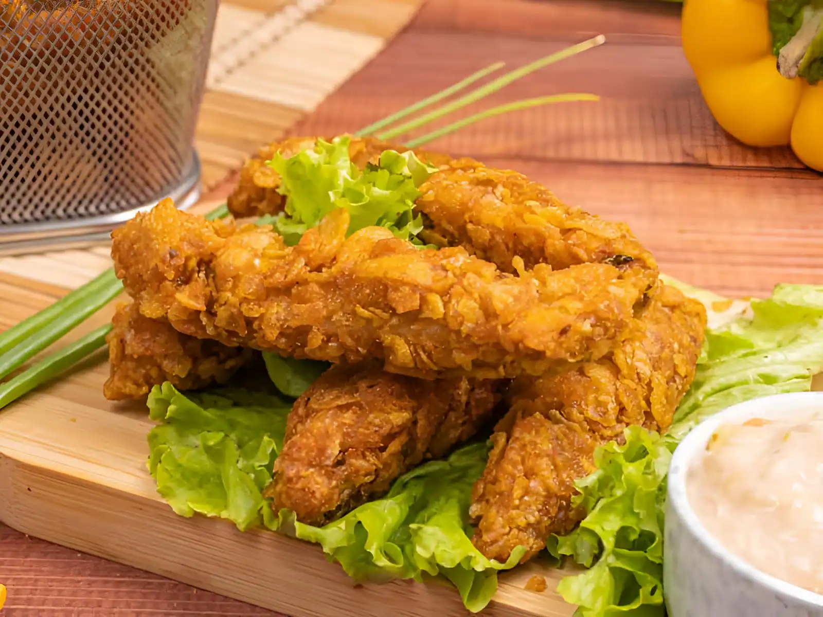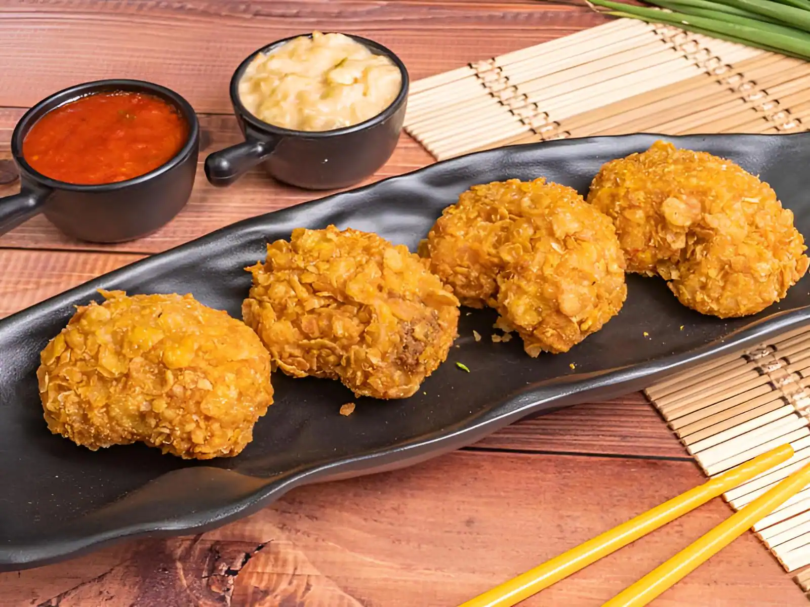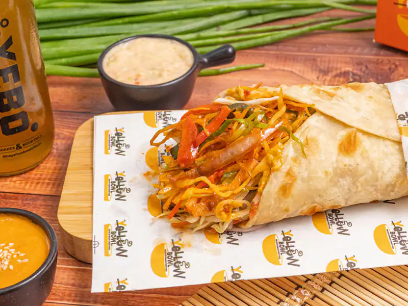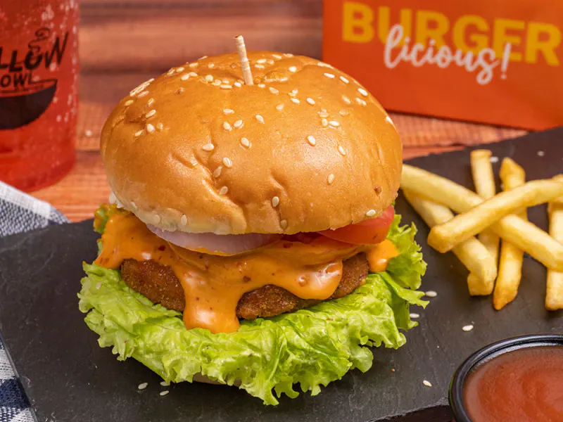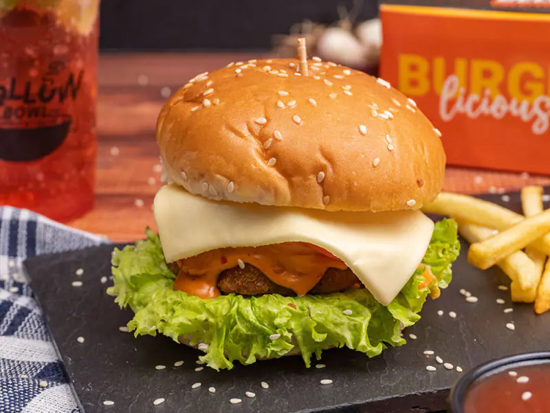 Burger with aloo tikki, fresh veggies and mayo in it. Served with ketchup.