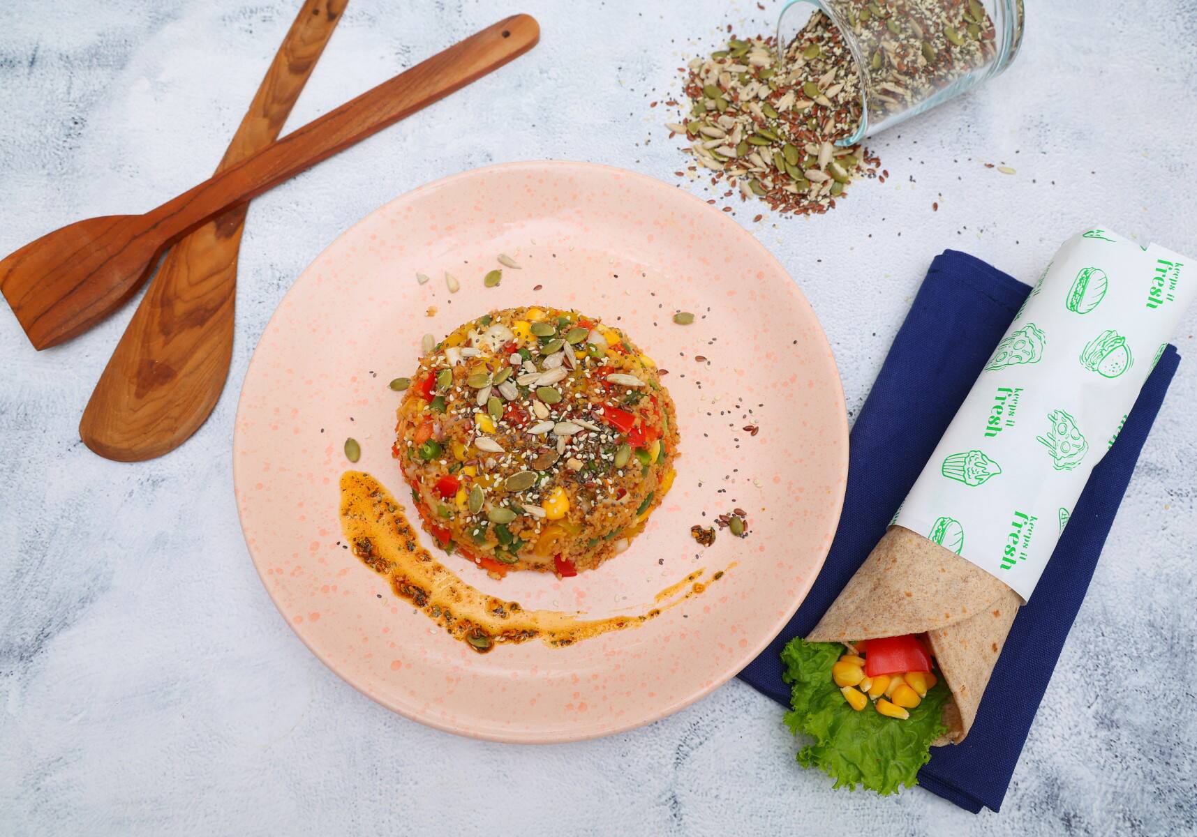 Mexican Cottage Cheese Wrap Mixed veggie, cottage cheese, Mexican salsa sauce. ₹229 Paneer Tikka Wrap Grilled paneer, tikka dip, onion, tomato, mixed herbs. ₹239 Falafel Wrap Falafel, mixed veggie, salad greens, olive, tahini, hummus dip. ₹249 Beetroot And Walnut Salad Combo 2 Beetroot and Walnut Salad+Mexican Cottage Cheese Wrap ₹499 Beetroot And Walnut Salad Combo 3 Beetroot and Walnut Salad+Paneer Tikka Wrap ₹509 Bulgur Wheat Salad Combo 1 Bulgur Wheat Salad+Falafel Wrap ₹499 Bulgur Wheat Salad Combo 2 Bulgur Wheat Salad+Mexican Cottage Cheese Wrap ₹479 Bulgur Wheat Salad Combo 3 Bulgur Wheat Salad+Paneer Tikka Wrap ₹489 Rainbow Salad Combo Rainbow Salad+Mexican Cottage Cheese Wrap ₹479 Beetroot And Walnut Salad Combo 1 Beetroot and Walnut Salad+Falafel Wrap ₹519