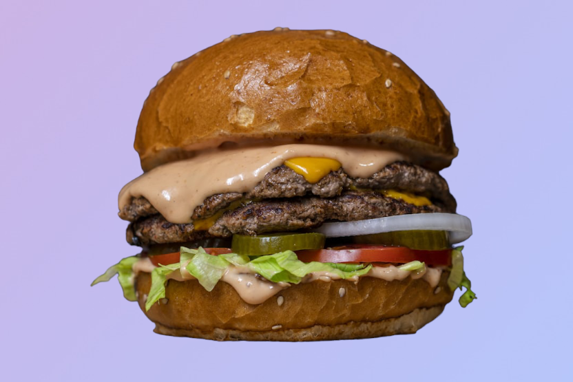 Juicy chicken burger topped with a mix of sauces, garnished with fresh lettuce and tomatoes, served with a side of fries.