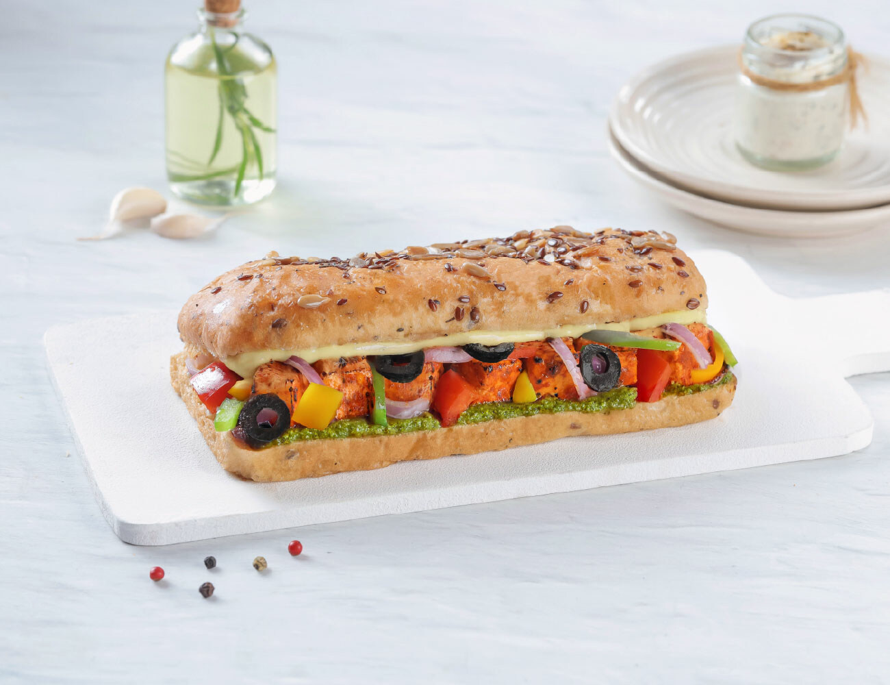 Double Portion Paneer Tikka | Spreads: Green Chutney, Thick Yogurt | Capsicum, Tomato, Onion | Multi-Grain Bread Protein: 36g | Carbs: 73g | Fat: 45g | Fiber: 6g