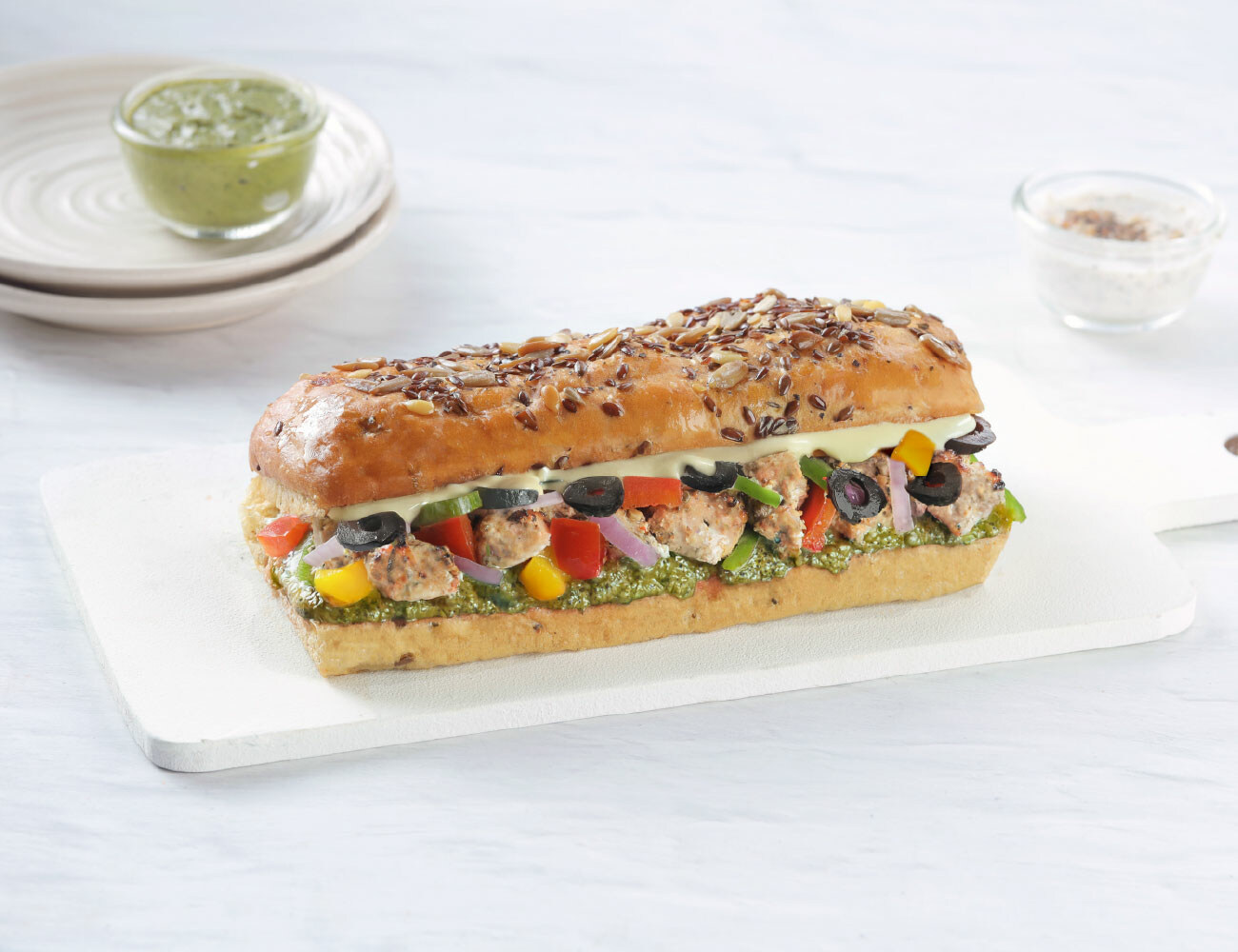 Grilled Chicken | Spread: Pesto | Real Mozzarella Cheese | Bell Peppers | Olives | Tomato, Onion | Multi-Grain Bread Protein: 46g | Carbs: 66g | Fat: 45g | Fiber: 8g