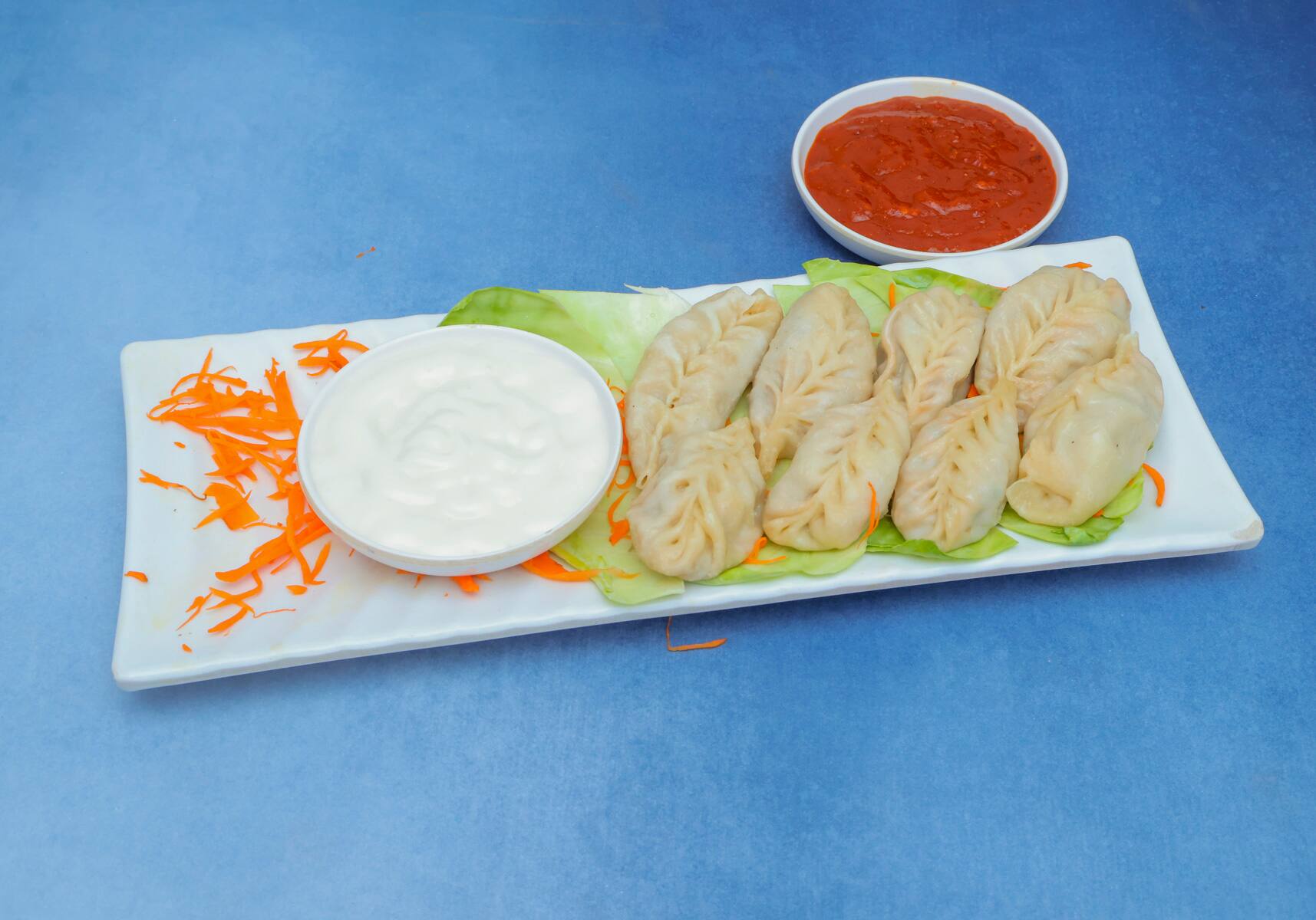 Delicate steamed chicken momos stuffed with savory minced chicken. Served with a spicy dipping sauce.