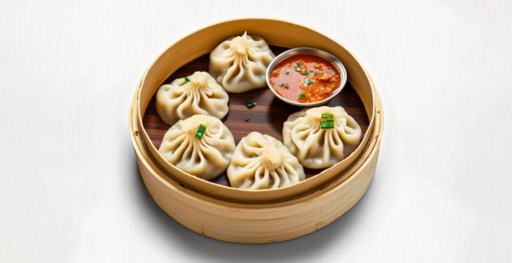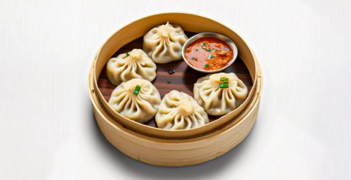 [6 Pieces] Fresh cottage cheese spiced with coriander, ginger & garlic momos steamed to perfection served with garlic red chilli sauce. (Serves 1-2)