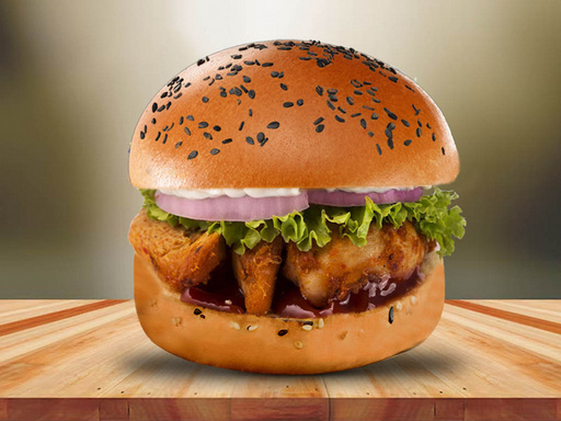 Freshly Griiled Chicken Fillets, Creamy Mayo And Ketchup Crunchy Lettuce And Freshly Chopped Red Onion With Toasted Caramlized Bun.