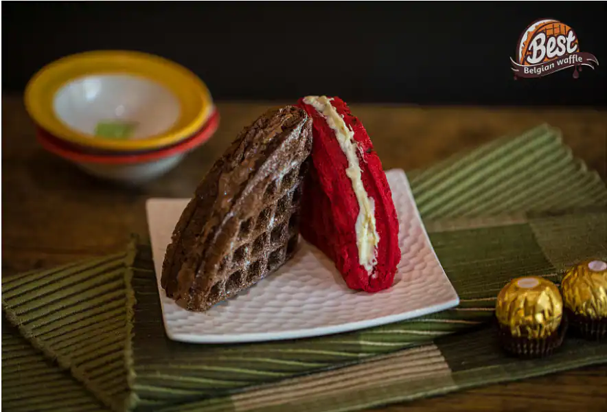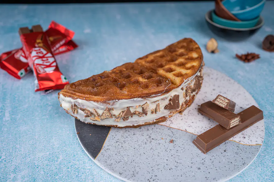 Not one, not two, but three enticing melted chocolates added to enhance the flavour. Dark chocolate waffle sandwich with the melted dark, milk and white chocolate.