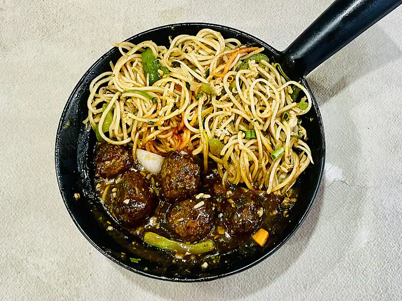 A delicious veg manchurian noodles bowl features crispy, fried vegetable balls in a savory, spicy manchurian sauce, served with your choice of noodles.
