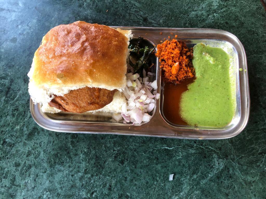 Vada Pav The dish consists of a deep fried potato dumpling placed inside a bread bun [pav] sliced almost in half through the middle. With red chilli along chutney. ₹18 Bhaji Kanda ₹30 Misal Pav ₹72 Bhaji Chapati ₹60 Upma How do you describe upma? Image result for upma description for food Upma, uppumavu, or uppittu is a dish originating from the Indian subcontinent, most common in Kerala ₹30 Bhaji Batata ₹36 Poha ₹30 Bhel ₹60 Veg Maggi ₹60 Rice Plate 3 Chapati , bhaji, varan, and dal ₹144
