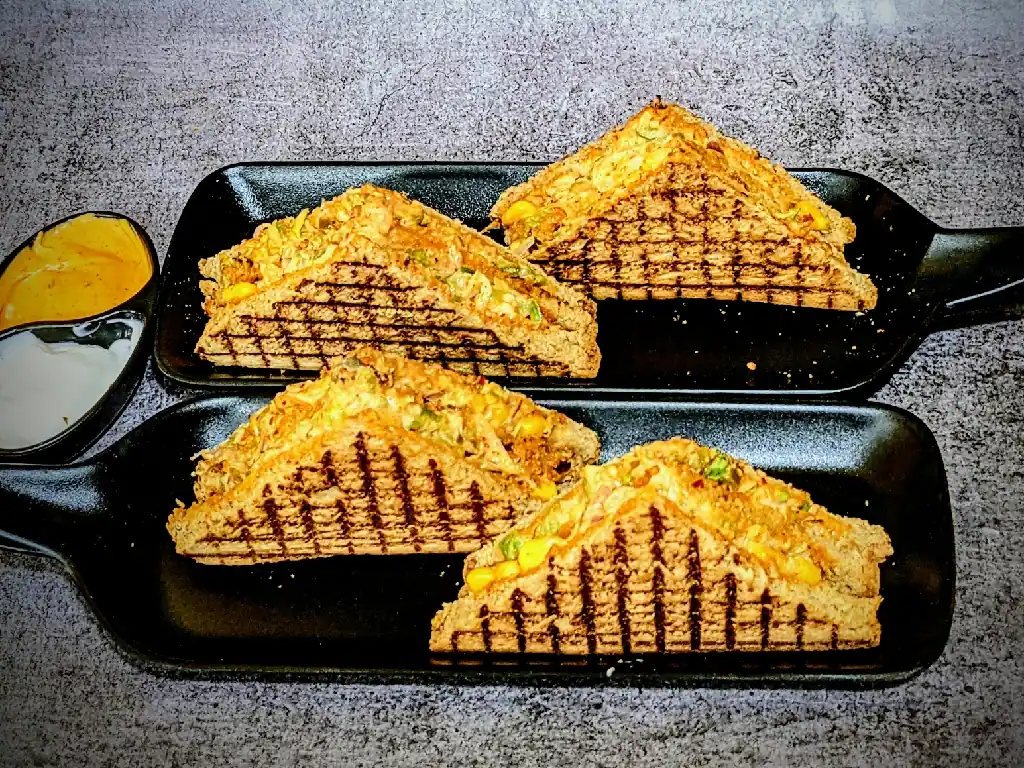 Crispy and juicy chicken fillet sliced and mixed with in house mayo, chilli garlic sauce, chopped onion stuffed between grilled bread [2 slices].