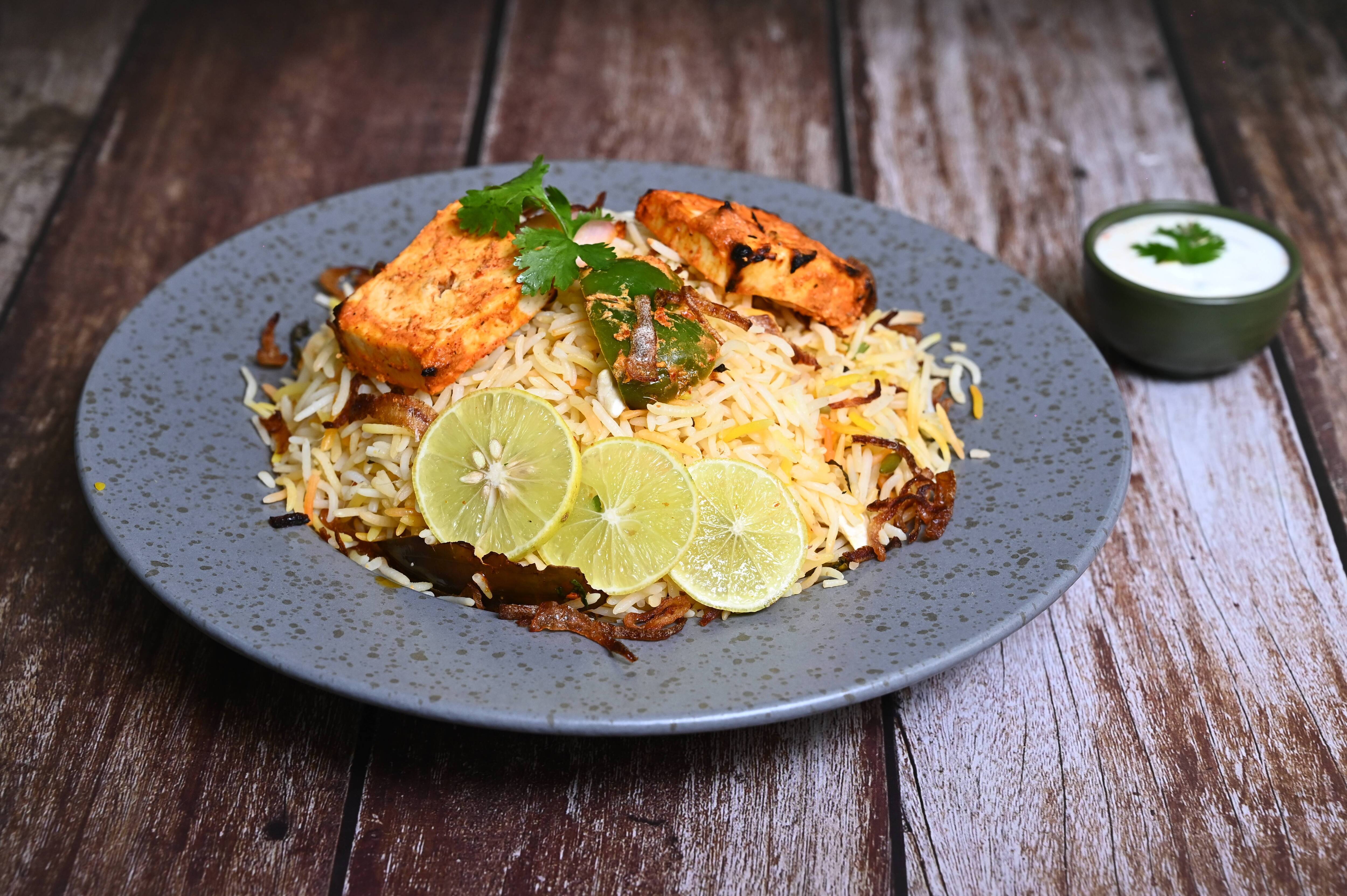 Flavorful biryani cooked in by marinating paneer with spices, Rice and Saffron.