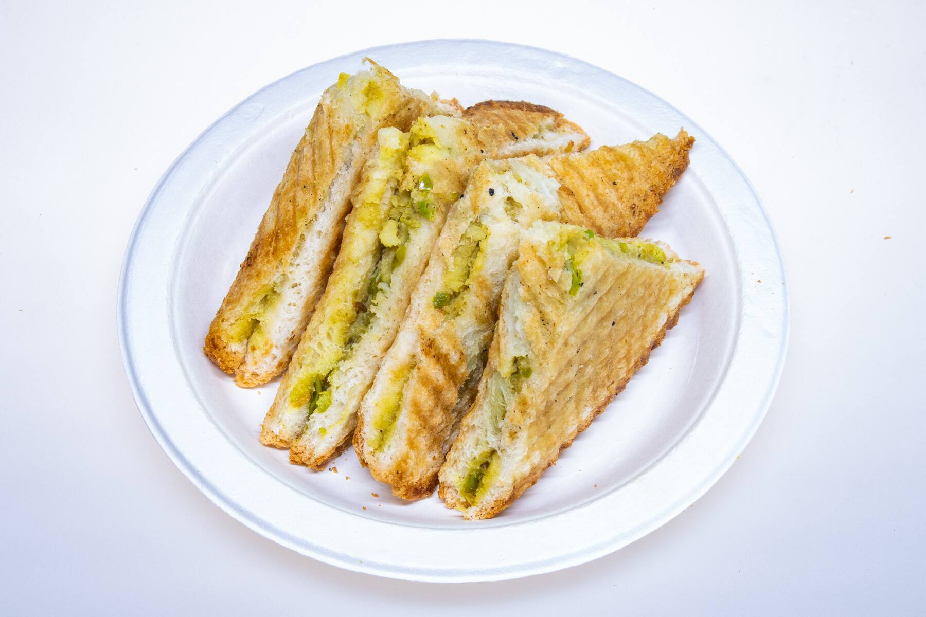 A flat round shaped crispy fried veg patty placed in burger bun with special sauce, Cheddar cheese slice and vegetables.