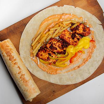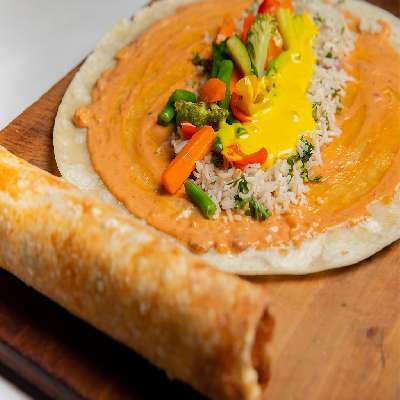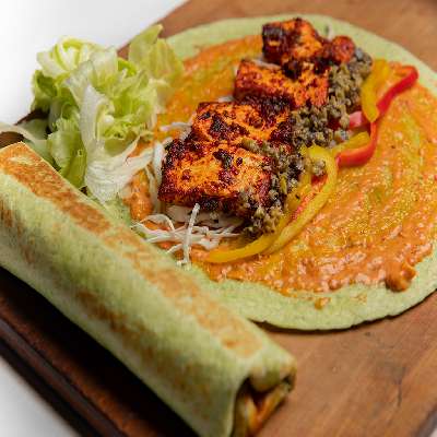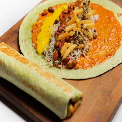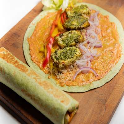 Serves 1 | 3 Pieces |Soft Shell Taco, gracefully enhanced with the bold essence of harissa sauce, caramelized onion, cauliflower rice, vibrant red cabbage, and a tantalizing drizzle of chili garlic mayo