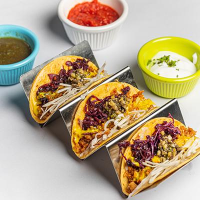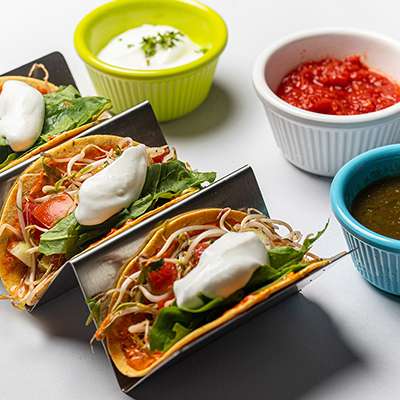 Serves 1 | 3 Pieces |Soft shell taco with chickpea and veggies, sour cream and harissa sauce