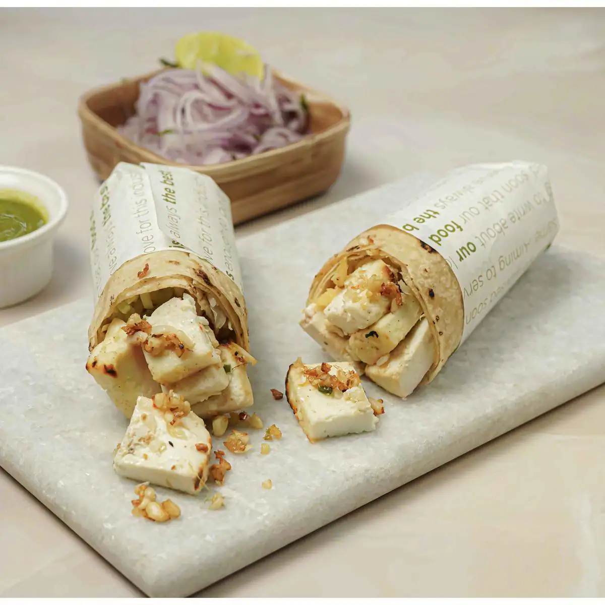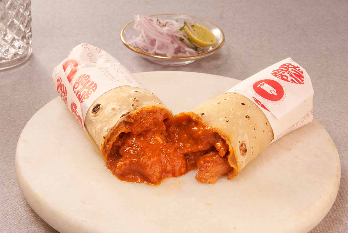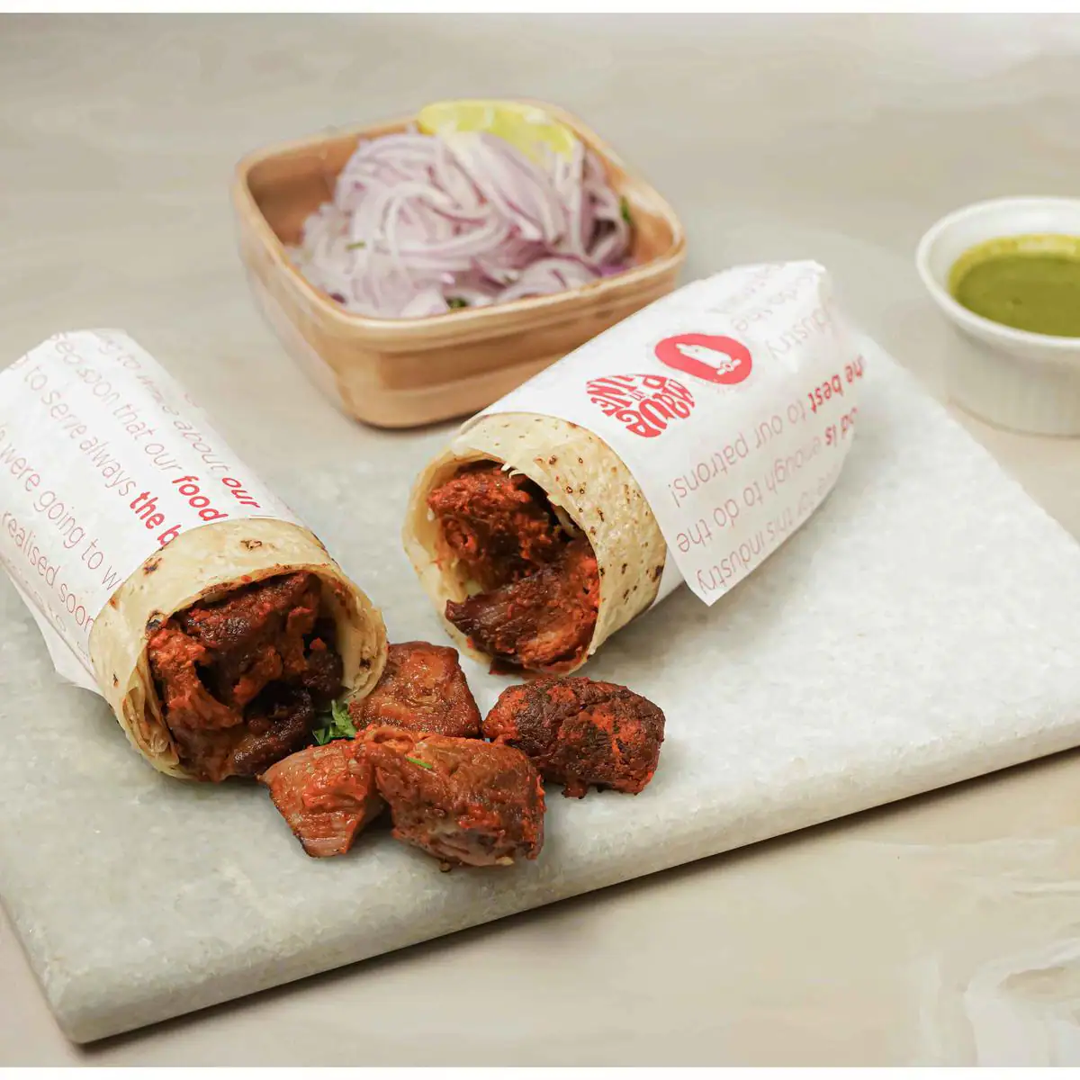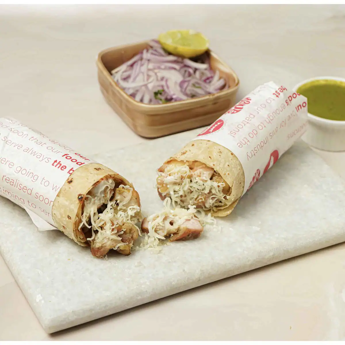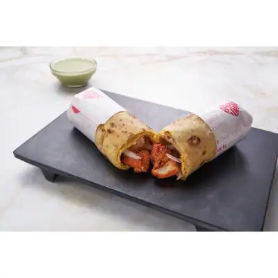 Juicy boneless chicken Tikka & wrapped in a soft roomali roti with Golden fried Egg, Mint & Tamrind Chutney & Fresh Onion Salad