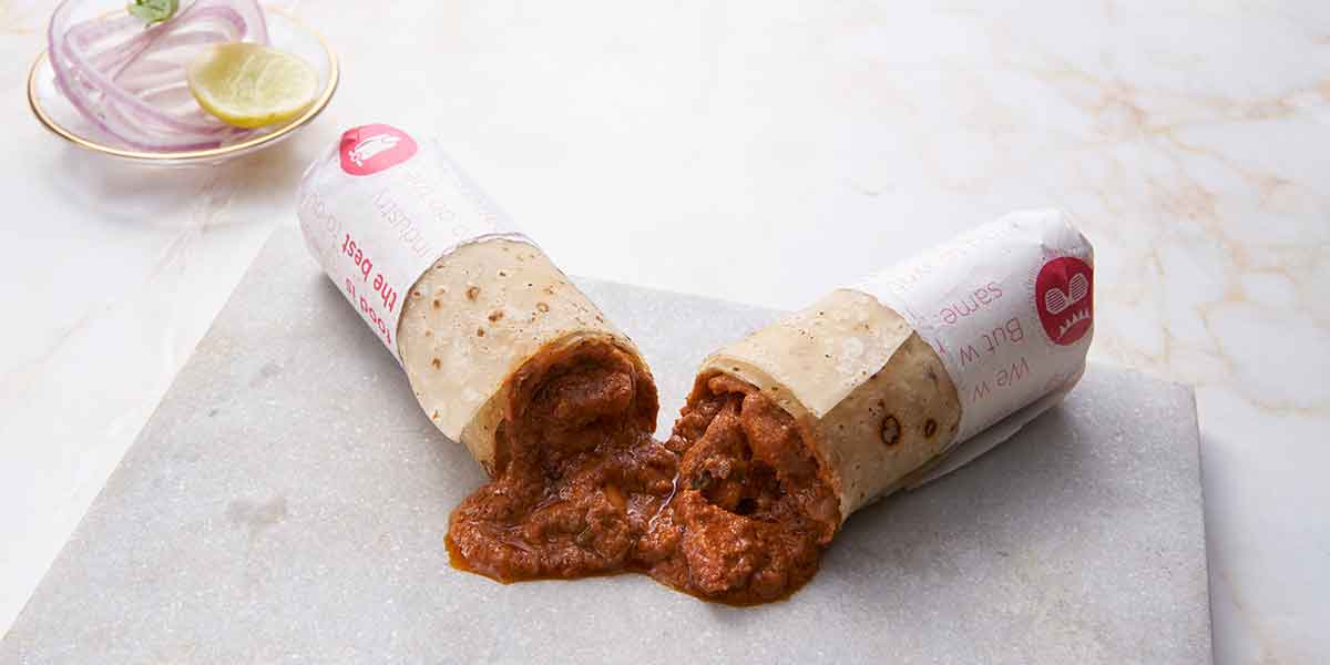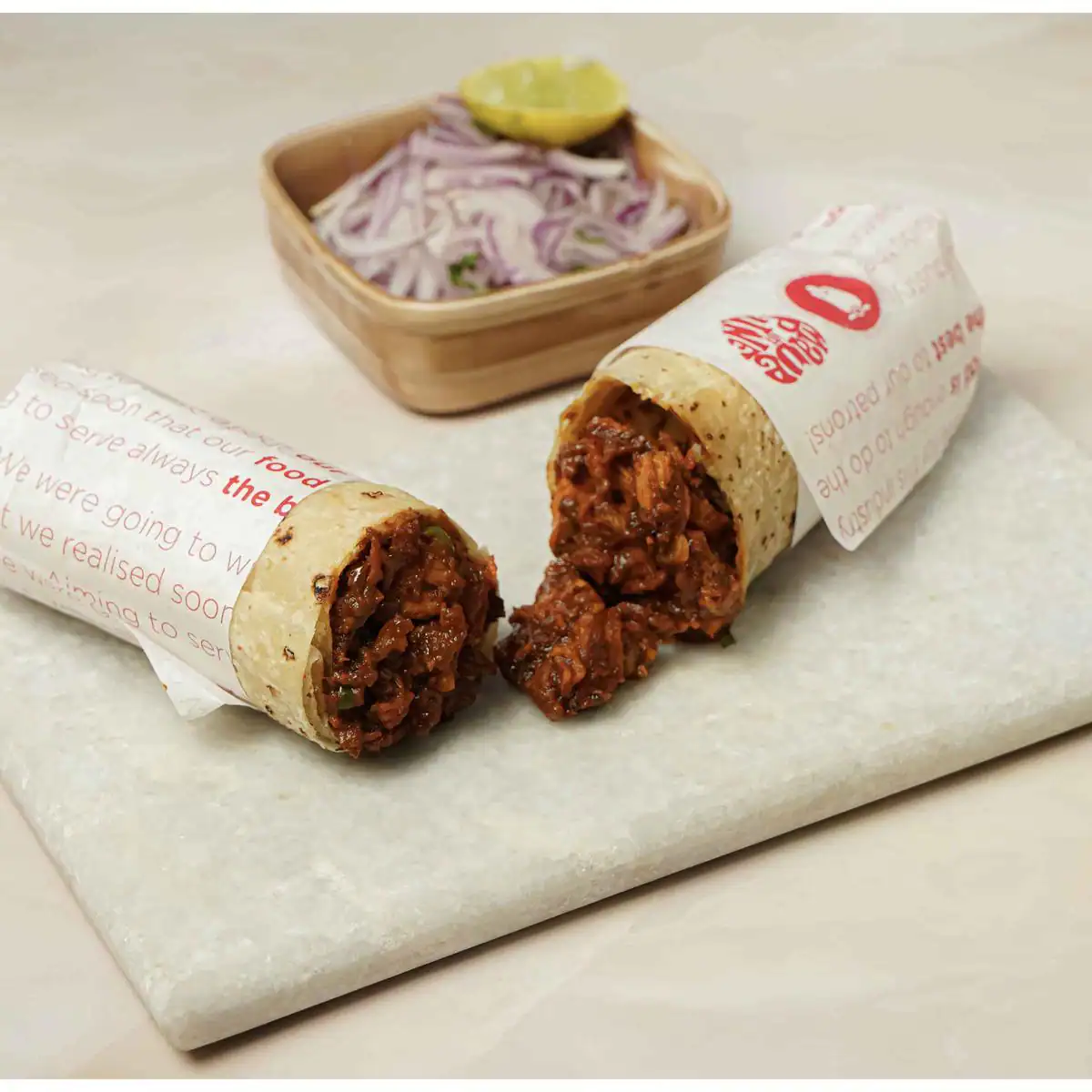 Fairly Dry spicy Chicken gravy wrapped in freshly made Roomali Roti served with onion salad.