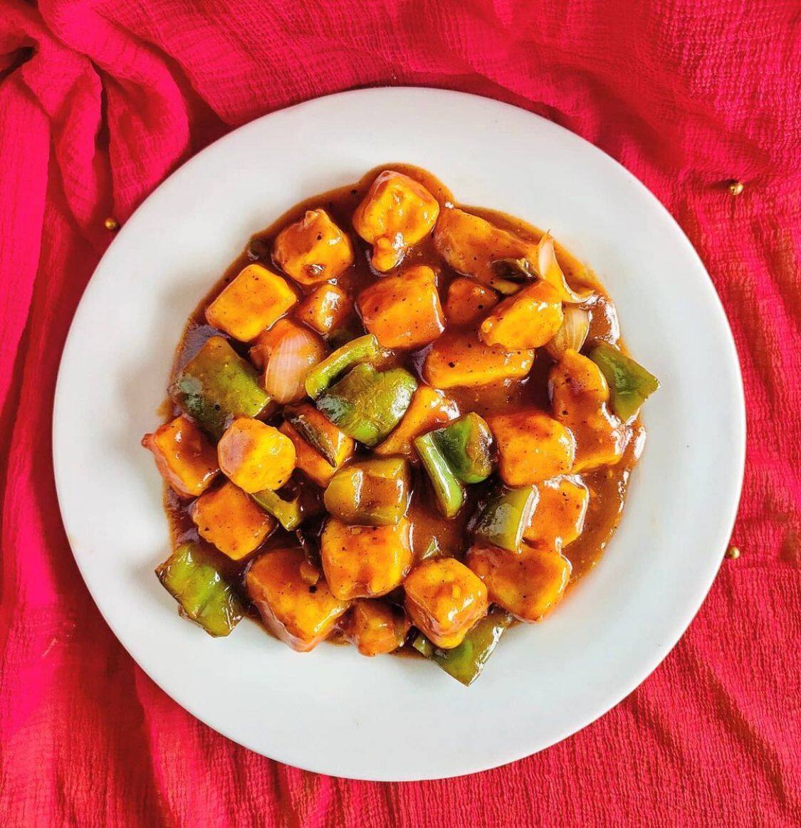 Firstly paneer is coated in corn starch batter and fried until crisp. Then a fresh chilly sauce is made by sautéing ingredients like garlic, capsicum and spring onions. Next red chili sauce, soya sauce and vinegar are added to make the sauce.