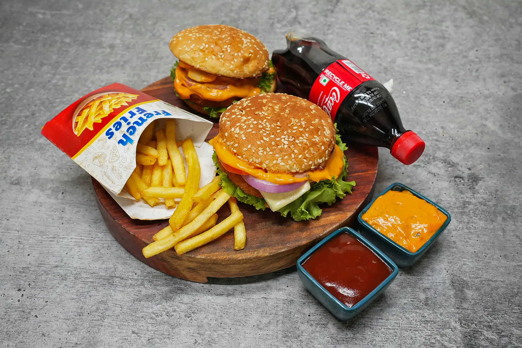 1 Burger with 2 patties. Classic vegetarian burger with plant based patties [2 pieces], crunchy lettuce, fresh onion and creamy sauce.
