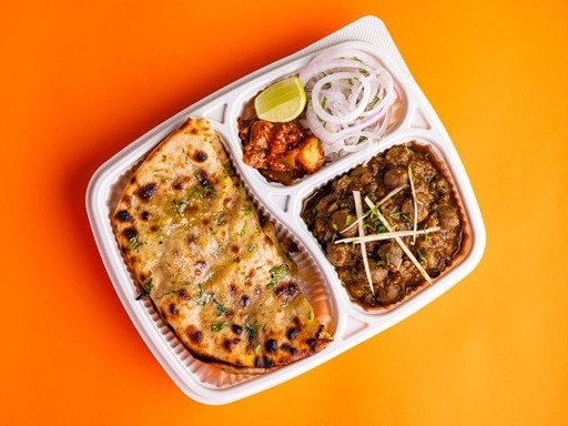 Stuffed Aloo Paratha Served With Chole, Onion, Pickle & Lime Wedge