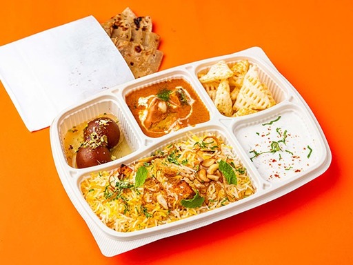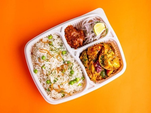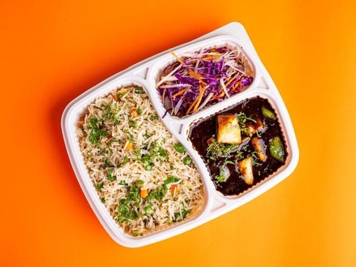 Kadhai Paneer Served with Green Peas Pulao, Onion, Pickle & Lime Wedge.