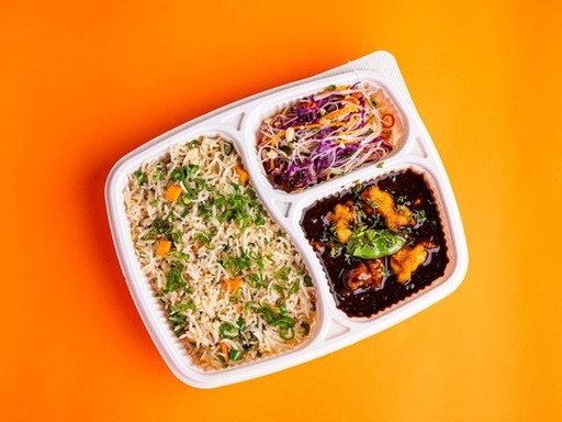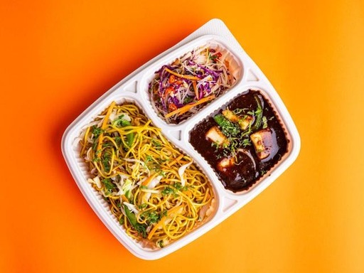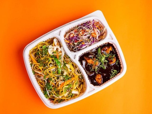 Chicken Manchurian served with Hakka Noodles and Raw Papaya Salad.