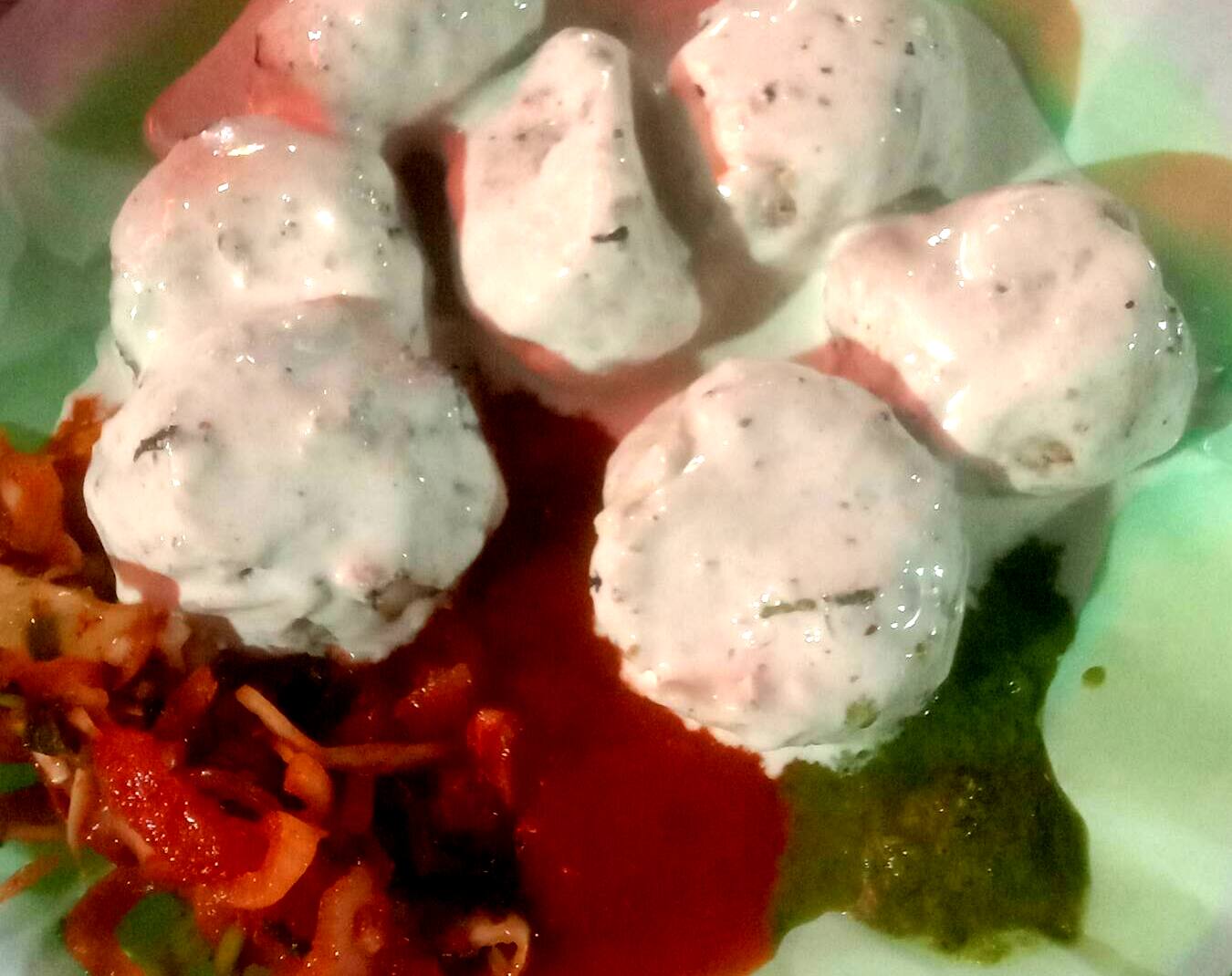 Homemade soya chaap marinated with homemade creamy cheese sauce cooked in charcoal, served with green chutney.