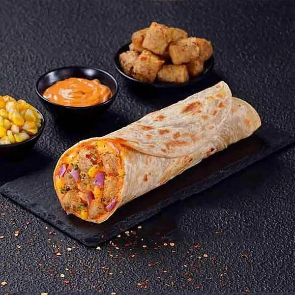 An expansive wrap with an equally grand surprise awaits. Within, you'll find crispy Mediterranean falafels, generously adorned with a cheesy corn salsa drizzle, accompanied by crunchy onions, all encased in a flaky paratha. The experience is nothing short of extraordinary in its sound, taste, and sensation.