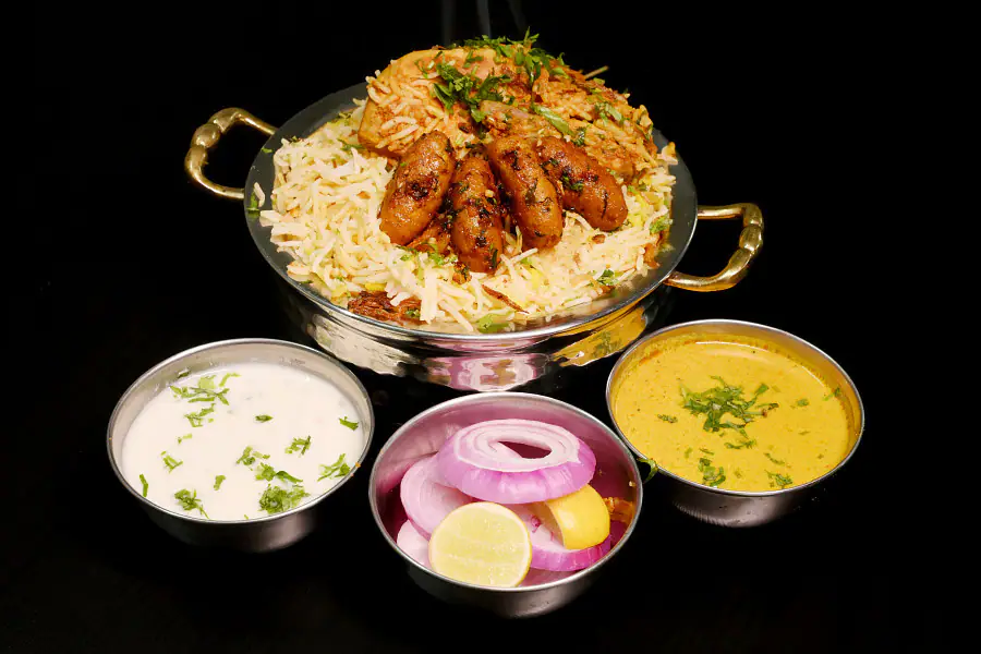 A SAOJI CLASSIC, SPICY CHICKEN CURRY, BAGARA RICE AND CHICKEN MUTTHI KEBAB