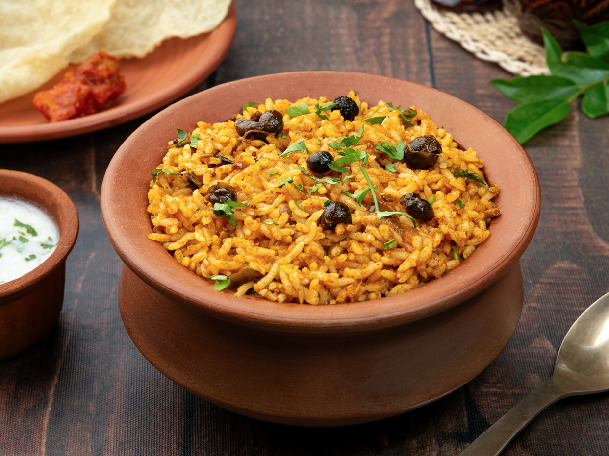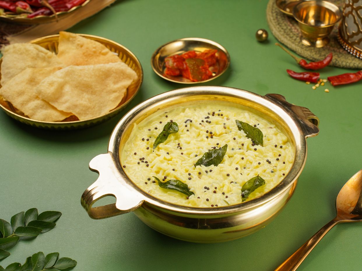 Rice cooked with flavorful Andhra style pappu (lentils) added with palak fresh leaves enhanced with a touch of desi ghee. Served with pickle and papad.