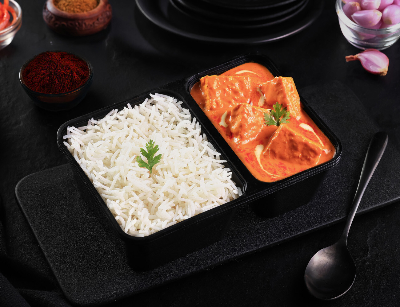 [Serves 1] Comes in a bowl with Masala Rice + Grilled chicken tikka in a flavour-packed tomato curry + Green Chutney + Garlic Yogurt + Salad. Ready to get 'bowl'ed?