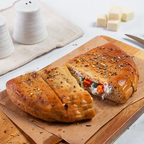 A cheesy, scrumptious appetizer! High fibre garlic bread stuffed with paneer tikka, onions, capsicum, generous cheese sauce, yummy oregano seasoning and chilli flakes. Allergen information: Gluten, dairy.