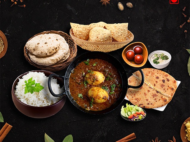 Egg Curry with 2 pcs of Egg served with one option of tawa roti/Paratha/Chawal with addon option of salad, roasted papad, mix raita and dessert